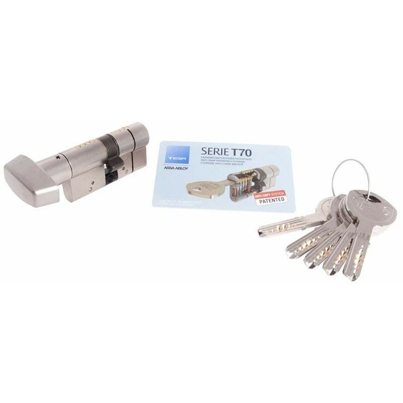 Cilindro doppio profilo europeo con pulsante T70. Il cilindro T70 è stato appositamente progettato per offrire una soluzione con garanzie contro l'attacco per rottura, offrendo a sua volta protezioni efficaci contro l'estrazione, il bumping e la foratura di grado 2. La particolare configurazione del collo della chiave (brevettata), la rende compatibile con gli stemmi a collo stretto. La sicurezza del cilindro è supportata da un brevetto che garantisce l'incopiabilità della chiave. Ha 6 pistoni + 1 sensore di sicurezza nel cilindro. Ha una durata di 100.000 cicli.