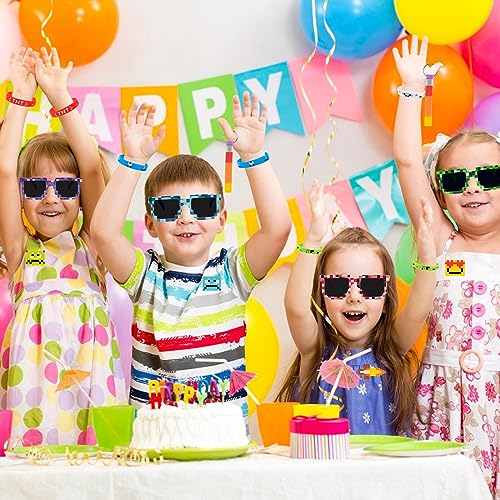 【Set Comprende】: occhiali da sole da 6 pixel, 12 braccialetti colorati, 10 spille emoticon, 6 portachiavi arcobaleno, che possono essere indossati per proteggere gli occhi e aggiungere divertimento di festa quando si va fuori, nuotare, escursioni e parchi a tema all'aperto in primavera ed estate