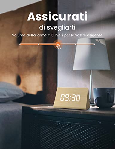 la sveglia funzionerà per 5 volte e vi sveglierà con un semplice bip bip. 5 livelli di volume della sveglia disponibili: non c'è bisogno di preoccuparsi se il suono della sveglia è troppo silenzioso per svegliarvi da un sonno profondo.