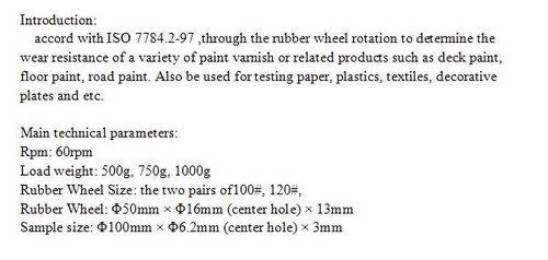 In conformità con la norma ISO 7784.2-97, attraverso la rotazione delle ruote in gomma per determinare la resistenza all'usura di una varietà di vernici o prodotti correlati come la vernice del coperto, la vernice del pavimento, la vernice stradale. Può essere utilizzato anche per testare carta, plastica, tessuti, piatti decorativi ecc.
