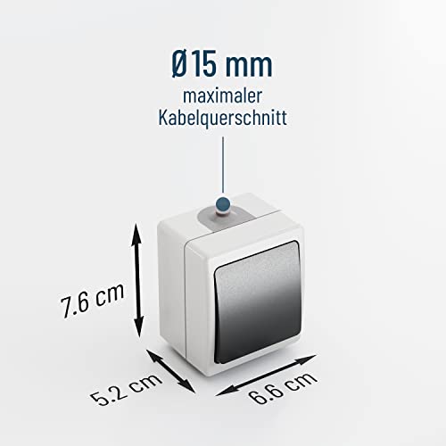 Contenuto della confezione: 3 interruttori a parete per ambienti umidi, 2 ingressi per cavi, grigio, tensione di esercizio 250 V AC 10 A