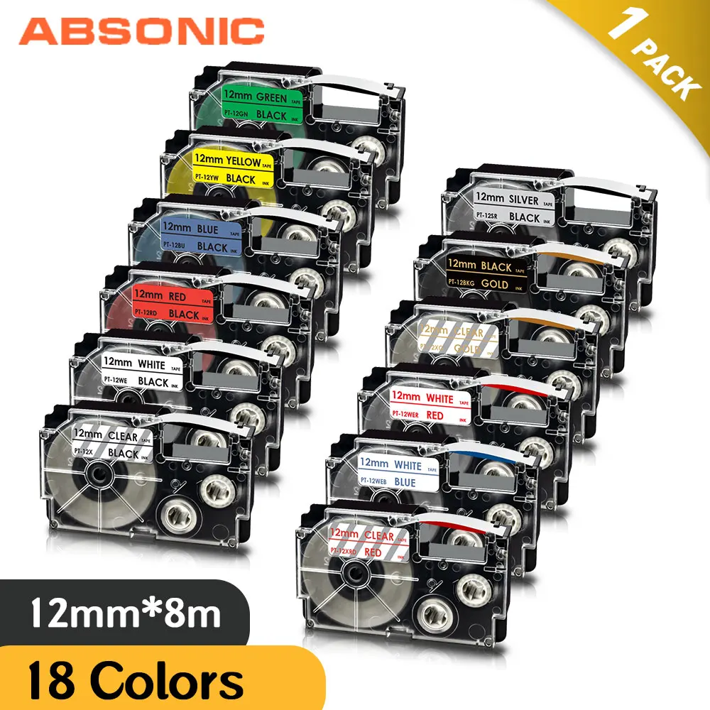 Absonic 6/9/12mm Label Tape for Casio XR-12X XR-12WE XR-9WE XR-6WE Ribbon Compatible for Casio KL-60 KL-120 KL-750 Label Maker