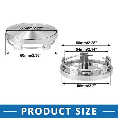 Ruota Centro Mozzo Tappo Dimensione - Esterno Diametro: 60mm/2.36", Interno Diametro: 54mm/2.14“, Clip a Clip Diametro:58mm/2.28", Clip a Clip Esterno Diametro: 66mm/2.6", Base Esterno Diametro: 56mm/2.2", Dimensione: 60x15mm / 2.36"x0.59"(L*H), Adesivo Diametro:56.5mm/2.22".