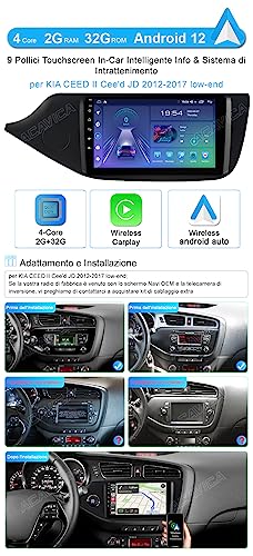ACAVICA Android 12 Autoradio per Kia CEE'd CEED JD 2012-2017 Lettore Multimediale Stereo GPS Navigazione con Wireless Carplay Touch Screen 2+32GB Bluetooth WiFi USB Controllo del Volante