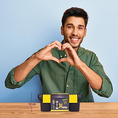 La pratica confezione include 100 ml di doccia per shampoo e cura, 100 ml di peeling per mani sporche, spazzola per unghie in legno, multi-tool e tutto confezionato in una fantastica cassetta degli attrezzi.