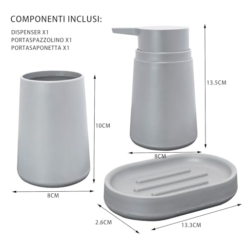 BM 4003 Set Accessori da Bagno Grigio in Plastica, Set Accessori Bagno Completo 3 Pezzi, Dispenser, Portaspazzolino, Portasapone (Grigio senza scopino)