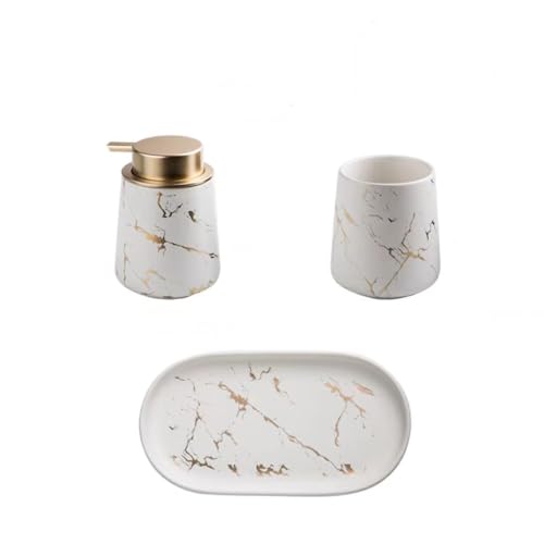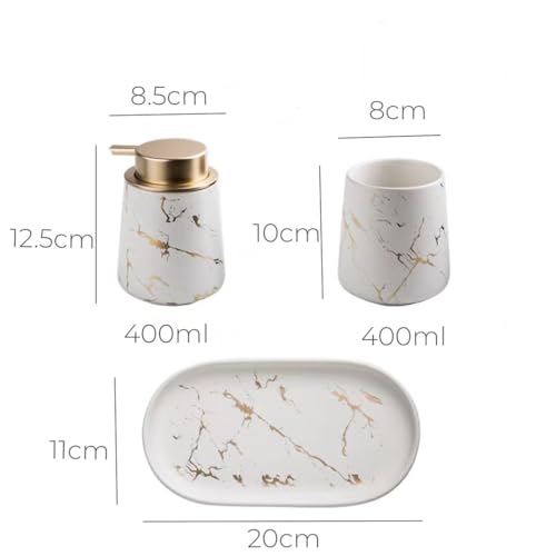 Set di accessori per il bagno, 3 pezzi, accessori decorativi per il bagno in ceramica con dispenser di sapone, bicchiere e vassoio da bagno, set di accessori per piano di lavoro da bagno, bianco e oro