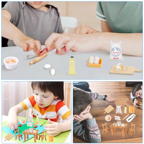 【Set perfetto】Mini Accessori per La Cucina Ll set include 1 x tavolo, 2 x sedia, 1 x vassoio, 2 x bicchieri per il latte, 1 x bollitore, 1 x mattarello, 1 x bastoncino per la miscelazione, 1 x sacchetto di farina, 1 x bottiglia di olio d'oliva, 1 x cestino per uova, 6 x uova, 1 x uova rotte, 1 x ciotola, 20 pezzi in totale. Questo set ha una varietà di accessori, piccoli e squisiti, è la migliore decorazione per le case delle bambole dei bambini fa.