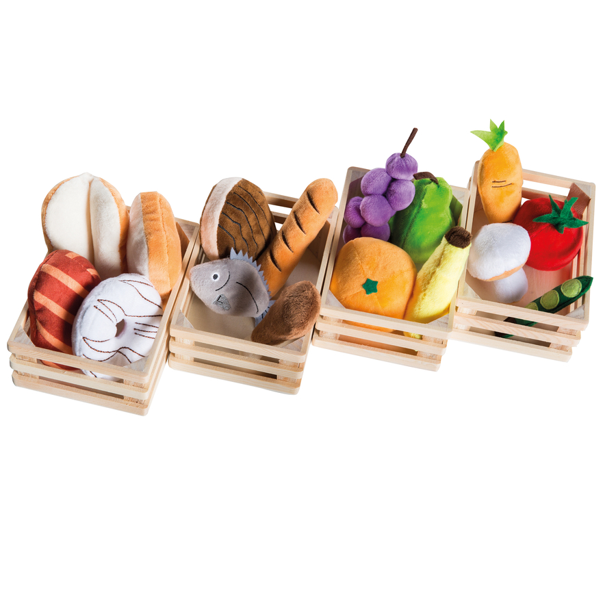 Questo set da gioco per bambini di roba, composto da 20 pezzi, è composto da quattro gruppi di alimentari ed è un'aggiunta ideale a qualsiasi banco o cucina da gioco per imparare a gestire il cibo in modo divertente. I quattro cestini di legno contengono alimenti in miniatura realizzati in coral fleece di alta qualità. I quattro diversi gruppi di alimenti sono: Cesto frutta: banana, uva rossa, pera, arancia Cesto verdura: funghi, piselli, pomodoro, carota Cesto paste: toast, panino, ciambella, pane Cesto proteine: pesce, würstel, bistecca, pollo Il set è adatto ai bambini dai 3 anni di età. Questo set di accessori per banco e cucina da gioco è stato sviluppato in Germania secondo la norma di sicurezza europea per i giocattoli EN 71. Tutti i materiali utilizzati sono testati e certificati per le sostanze nocive, resistenti alla saliva e rispettosi della pelle. Dettagli del prodotto: Materiale: coral fleece, legno In tessuto 20 pezzi Quattro cestini di legno con cibo di coral fleece e materiale feltro Cesto frutta: banana, uva rossa, pera, arancia Cesto verdura: funghi, piselli, pomodoro, carota Cesto paste: toast, panino, ciambella, pane Cesto proteine: pesce, würstel, bistecca, pollo Età: a partire da 3 anni Attenzione: Non adatto ai bambini di età inferiore a 3 anni. Pericolo di soffocamento, causa piccoli pezzi.