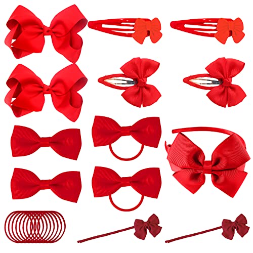 La confezione include: 23 pezzi per capelli con fiocco rosso, tra cui 1 fascia per capelli, 2 grandi fermagli per capelli, 2 piccoli fermagli per capelli, 2 fermagli per capelli con fiocco, 2 clip a goccia d'acqua, 2 clip per fiocco ondulato, 2 clip per tessuto Bowknot, 2 elastici per capelli con fiocco e 10 elastici per capelli rossi, con stili diversi e sufficienti. quantità per soddisfare le esigenze delle ragazze.