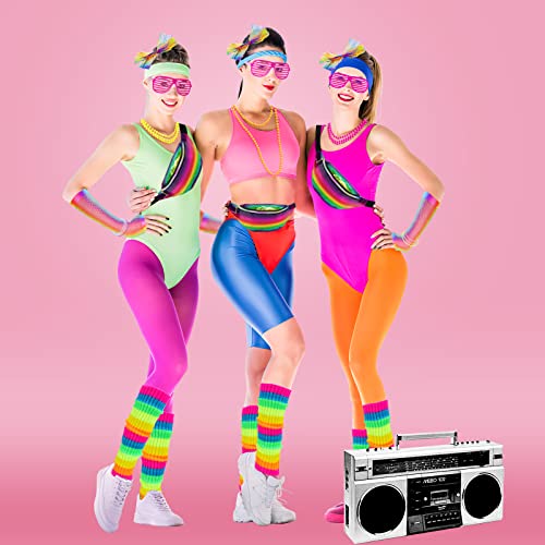 Eleganti accessori da donna anni '80: riceverete un totale di 23 pezzi: 1 marsupio da cintura al neon, 1 paio di scaldamuscoli, 1 paio di occhiali Shutter, 1 paio di guanti a rete senza dita, 1 paio di orecchini vintage, 1 fascia in pizzo, 4 collane e 10 bracciali neon in plastica. Il classico set di accessori anni '80 per le donne può soddisfare il vostro vestito fino alle esigenze.