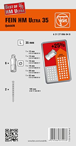 FEIN Set di accessori Best of frese a corona QuickIN, 6 Punte Trapano a Corona e 2 Perni di Centraggio, Profondità di Taglio 35 mm, Valigetta Attrezzi in Plastica 63127086040