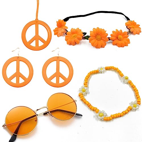 5 Set di Accessori Hippie Costume Accessorio per costumi anni '60-'70 Occhiali da Festa Hippie Include Occhiali da Sole Fascia per Capelli Collana e Orecchini con Segno di Pace (Arancione)