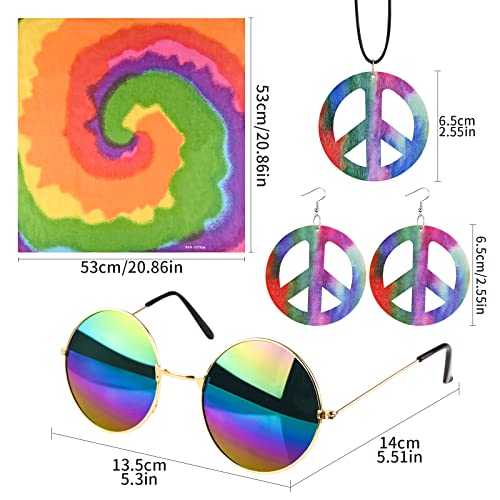 Costume hippie: il costume hippie include 1 paio di occhiali da sole hippie, 1 collana con medaglione della pace e 1 orecchino con segno di pace, 1 fascia per capelli, mostra uno stile anni '60 e '70, taglia unica per la maggior parte dei bambini, adolescenti e adulti.