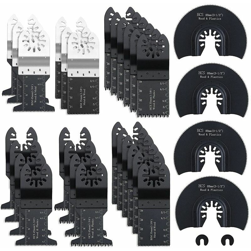 Realizzato in acciaio al carbonio e utilizzando tecniche di produzione di qualità che garantiscono velocità di taglio, tolleranza all'usura e durata di vita superiori. I contrassegni di lunghezza incorporati su entrambi i lati, un lato in pollici e l'altro in centimetri, assicurano che Ottieni tagli precisi rapidamente e facilmente mentre lavori. 2 tipi di lame per seghe di precisione appositamente progettate hanno denti più lunghi e ondulati appositamente progettati per fornire tagli più rapidi e puliti in legno e plastica. 30 pezzi includono 6 tipi di lame per seghe diverse per il taglio di legno, metallo, plastica e altri materiali, ogni tipo di lama per sega è specifico per uno scopo specifico. Le nostre lame per seghe oscillanti possono soddisfare una varietà di esigenze, che possono essere utilizzate per officina, casa o altri luoghi. Elenco kit da 32 pezzi: 6 lame per sega a denti fini ad alto tenore di carbonio da 34 mm 6 lame per sega a denti grossi da 34 mm ad alto tenore di