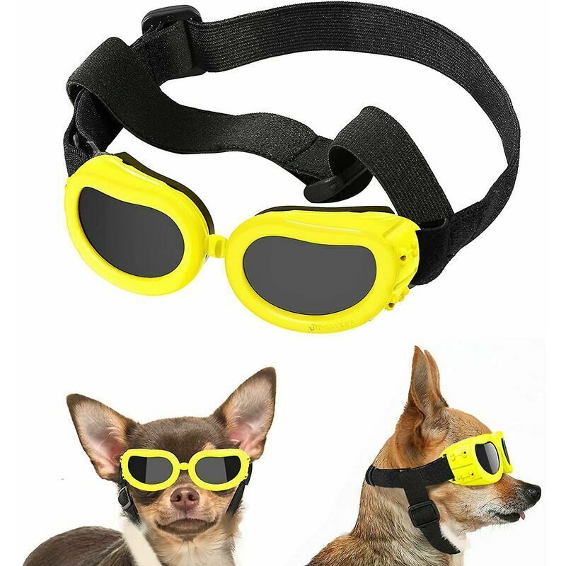 Materiale: le lenti sono realizzate in resina AC, montatura per occhiali con materiale EVA + PC, resistente, leggero, confortevole, adatto a cani di piccola taglia come foto quotidiana o oggetti di scena, abbigliamento da esibizione. Fornisce la migliore protezione per gli occhi contro i raggi UV/vento/acqua/detriti. Il cinturino elastico regolabile con fascia flessibile può adattarsi alle dimensioni del tuo cane e il design del sottogola non ti preoccupa mai di cadere facilmente. La testa e il mento hanno un cinturino elastico di precisione per indossarlo facilmente. Ampia applicazione: gli occhiali per cani sono adatti per l'uso quotidiano, foto, feste, matrimoni e vacanze, vesti il tuo cane per renderlo più accattivante, chic e adorabile. Tampone in spugna all'interno: la spugna è imbottita attorno alle lenti, la spugna ad alta densità ha un eccellente effetto traspirante, allevia perfettamente l'affaticamento degli occhi o la pressione degli occhiali e il cane non si sentirà a
