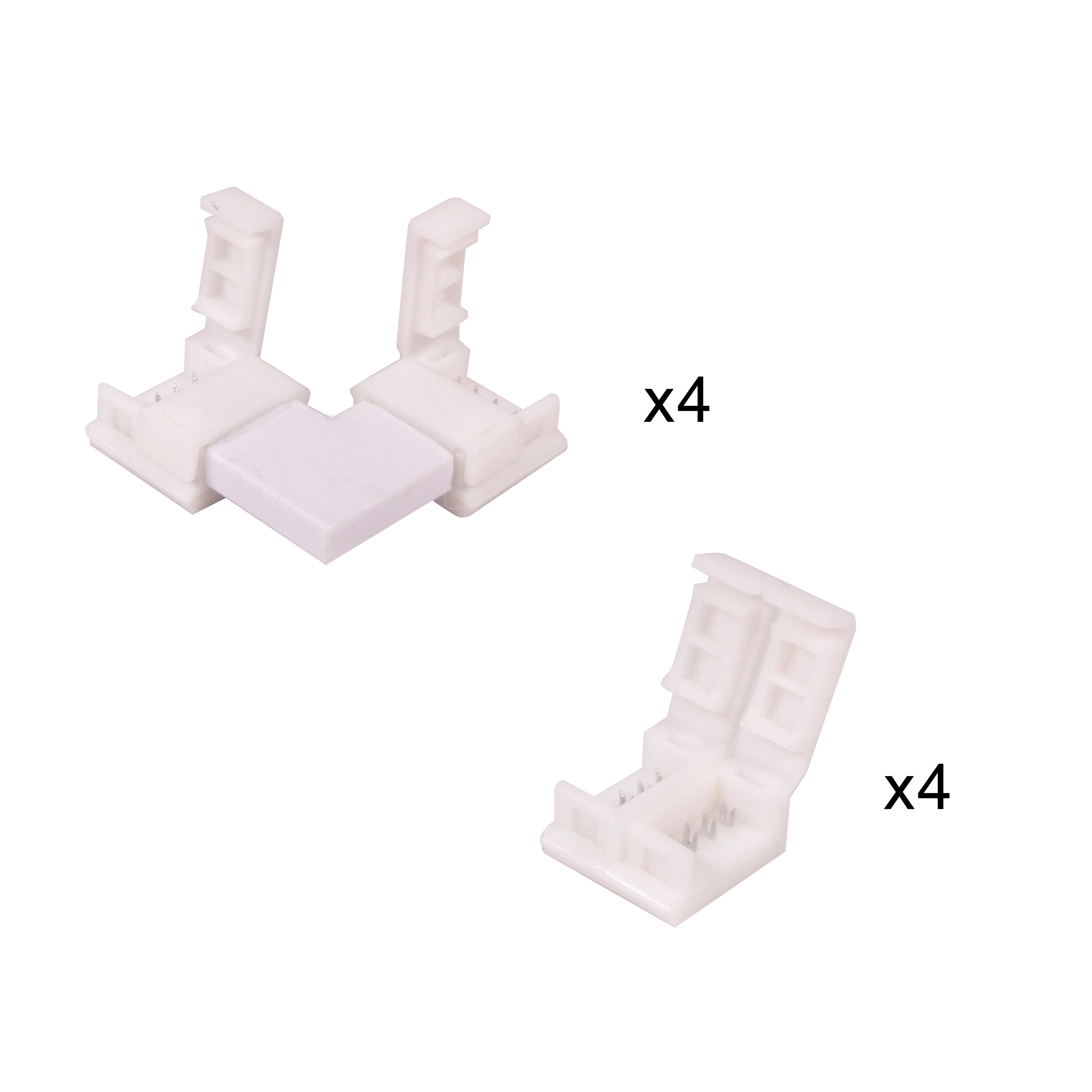 In plastica, confezione da 8 pezzi (4 connettori angolari e 4 connettori dritti)