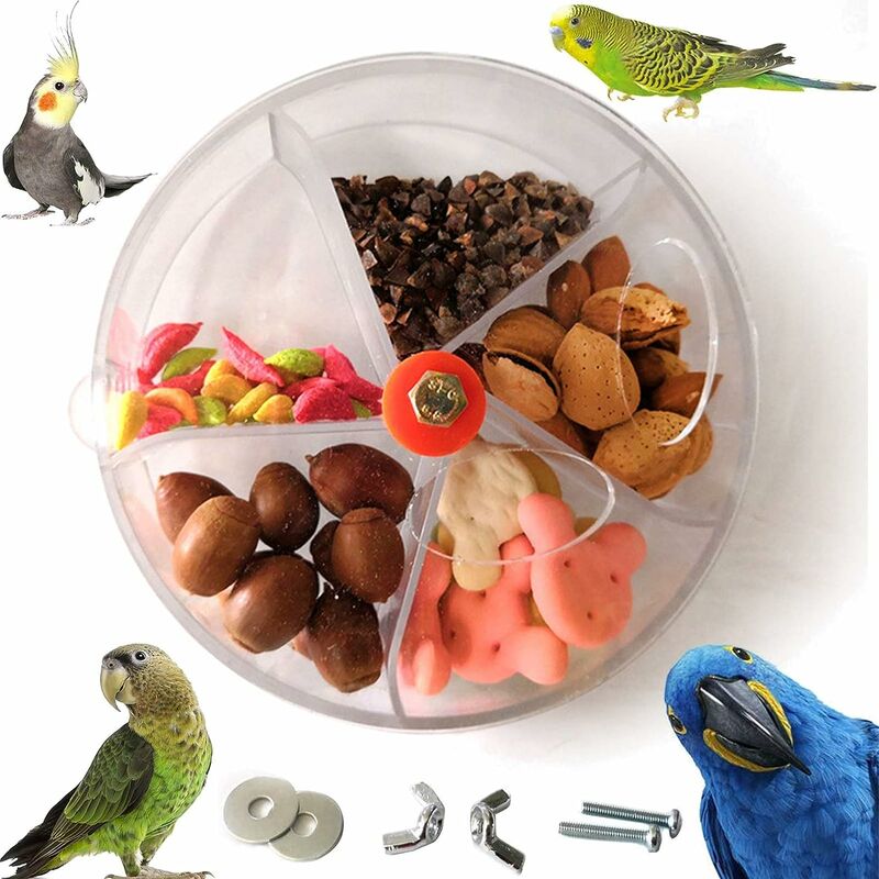 Il prodotto è realizzato con materiali di alta qualità ed è una mangiatoia per uccelli molto pratica. Le mangiatoie per uccelli sono facili da riempire, sicure, non tossiche e innocue per gli uccelli. Il policarbonato assemblato, rimovibile, raffinato, bello e resistente è facile da pulire e mantenere, circa 13 cm di diametro e 120 g di peso, facile da installare e non facile da danneggiare. La scatola del mangime è classificata e suddivisa in 5 scomparti in cui possono essere collocati diversi tipi di mangime per soddisfare le diverse esigenze del pollame. La ruota di alimentazione ricaricabile rotante ha una struttura trasparente in modo che gli uccelli possano vedere il mangime in ogni camera della ruota e prendere le proprie decisioni. Il giocattolo cerca uccelli facile da installare è incluso. Con viti di montaggio facili da rimuovere e pulire, puoi fissarle alla gabbia se necessario per un'alimentazione facile. La parte anteriore della mangiatoia può essere ruotata per allenare