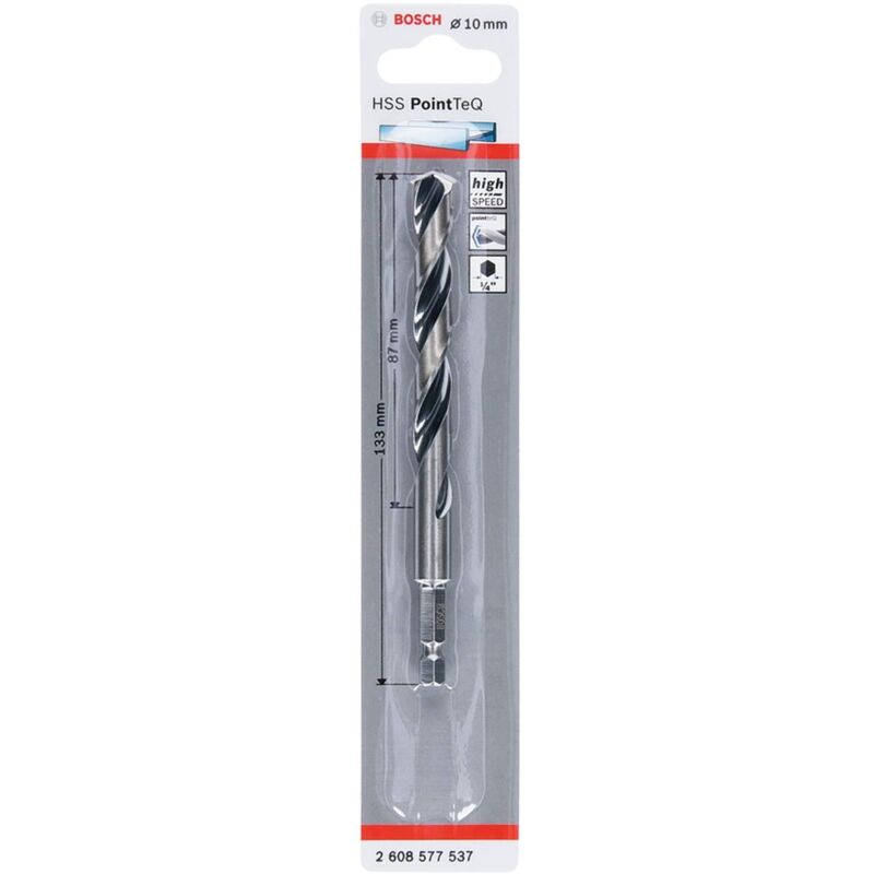 Punte HSS PointTeQ a innesto esagonale da ¼ per avvitatore a percussione e trapano avvitatore Questa punta per trapano HSS PointTeQ ha un diametro di 2,0 mm e una lunghezza di lavoro di 24 mm. Questa punta è adatta per l'uso con lamiere, alluminio e acciaio da costruzione, ma anche plastica e legno. L'attacco esagonale da ¼ si aggancia in modo sicuro nel mandrino di serraggio del trapano avvitatore o dell'avvitatore a percussione per garantire una foratura affidabile senza scivolamento della punta. La punta di centraggio PointTeQ automatica consente di forare rapidamente ed efficientemente senza bisogno di punzonatura o preforatura. La lattina rivestita di ossido nero per la rimozione della polvere assicura una rapida rimozione dei trucioli. Questa punta è universalmente compatibile con trapani avvitatori e avvitatori a percussione di tutte le marche con supporto esagonale da ¼. Contenuto: 1 punta per trapano HSS PointTeQ da 10 mm.