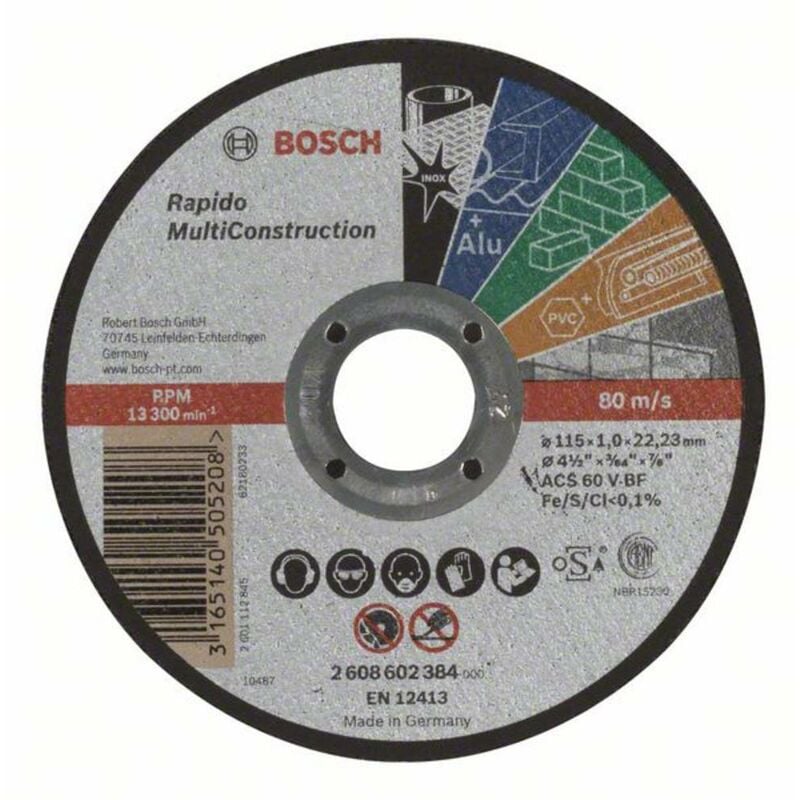 Dettagli tecnici Contenuto 1 pz. Dimensione, Ø 115 mm Dimensioni (Ø) 115 mm Idoneità del materiale Metallo, Acciaio inox, Metalli non ferrosi, Pietra, Marmo, Plastica Spessore 1 Tipo prodotto Disco di taglio dritto Ø foro 22.23 mm Mola da taglio dritta Rapido Multi Construction ACS 60 V BF, 115 mm, 1,0 mm Mola da taglio dritta Rapido Multi Construction. Specifiche: C 60 T BF. Diametro: 115 mm, diametro di foratura: 22,23 mm, spessore: 1,0 mm. Tagliare quasi tutto senza sostituzione della mola. Mola da taglio dritta per metallo, acciaio inossidabile, metalli non ferrosi, pietra, piastrelle morbide, marmo morbida e materiali plastici. Adatto a smerigliatrici guidate a mano. Velocità periferica massima: 80 m/s (a seconda del numero di giri e del diametro della mola). Fe/S/Cl inferiore dello 0,1 percento. La sottile mola Rapido offre molti vantaggi: un taglio rapido e nitido con il minimo sforzo. Alta precisione. Meno rumore e polvere e nessuno scolorimento bluastro o sbavatura. Incluso