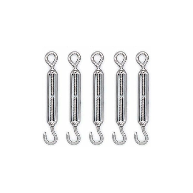 Materiale: realizzato in acciaio inossidabile 304 di alta qualità, resistente alla ruggine e durevole. Usi multipli: eccellente per regolare la tensione o la lunghezza di cavi, funi, tiranti dello sterzo e altri sistemi di tensione. Ampiamente usato per uso interno ed esterno. Peso: 200 g. Dimensioni: M5 Il pacchetto include: 5 ganci tenditore del filo Facile da usare: basta ruotarlo per regolare la tensione quando lo si utilizza su uno stendibiancheria, cavi di catene e ponti o altro applicazioni.