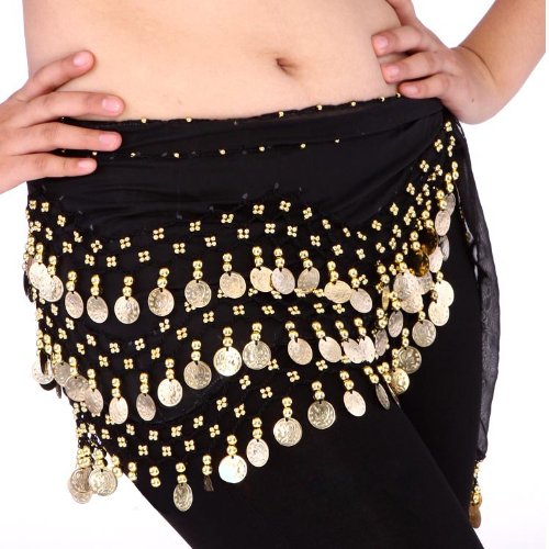 Accessotech 3 Righe Danza del Ventre Costume Hip Sciarpa Gonna con Cintura Oro Moneta Ballerina Danza Avvolgente - Nero