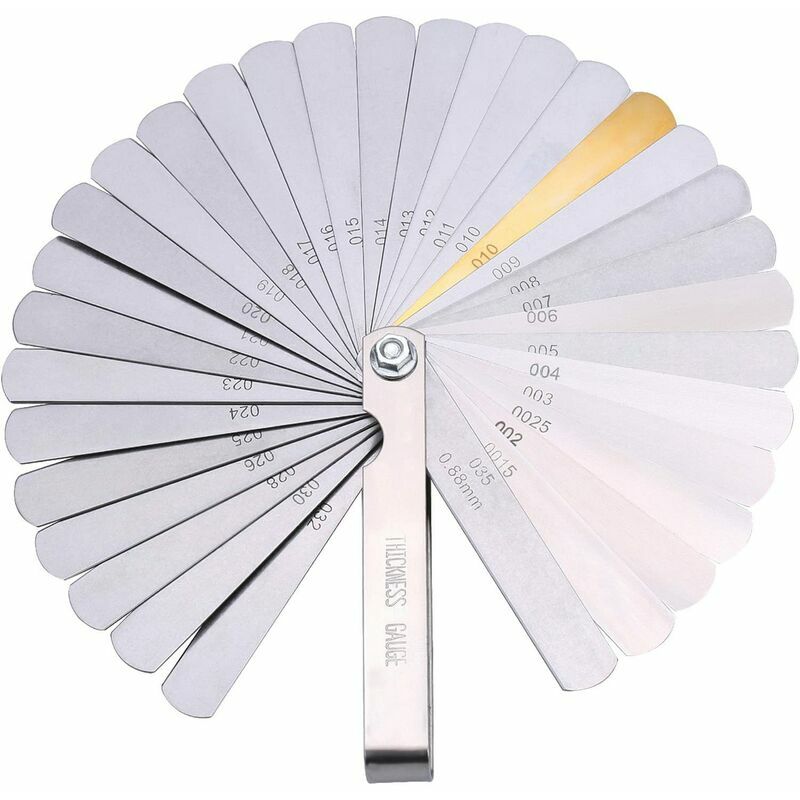 usalo se non devi fare esercizio l'intero insieme. 2 diverse unità di misura: Doppia marcatura metrica e imperiale, da 0,0015 pollici/ 0,04 mm a 0,035 pollici/ 0,88 mm, i numeri delle dimensioni sono incisi nello spessimetro per una facile identificazione. 32 diverse misure metriche (mm): 0,04, 0,05, 0,06, 0,08, 0,10, 0,13, 0,15, 0,18, 0,20, 0,23, 0,25, 0,25, 0,28, 0,30, 0,33, 0,35, 0,38, 0,40, 0,43, 0,45, 0,48, 0,50, 0,53, 0,55, 0,58, 0,60, 0,63, 0,65, 0,70, 0,75, 0,80, 0,88. 32 diverse dimensioni imperiali