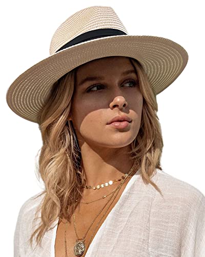 Accsa Cappello Panama di Paglia da Donna Uomo Regolabile Cappello da Spiaggia Estivo Fedora Cappello da Sole a Tesa Larga Anti-UV per Giardino da Viaggio