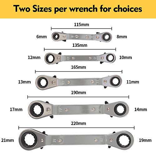 Chiave a cricchetto 5 pezzi Set di chiavi offset di alta qualità che puoi ottenere: Metrico 6x8 mm, 10x12 mm, 11x13 mm, 14x17 mm, 19x21 mm. Meccanismo reversibile a cricchetto a doppio anello con 72 denti. Commutabile rapidamente con una sola mano per una rotazione regolare in senso orario e antiorario.