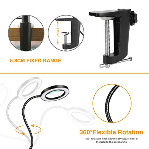 Collo d'oca flessibile in metallo con 360 gradi: la lente d'ingrandimento leggera stessa ha un collo d'oca flessibile in metallo e una clip. Completamente regolabile in qualsiasi posizione desiderata, design ergonomico a 360 gradi per un'ampia area di visualizzazione. Le lenti d'ingrandimento da tavolo sono professionali per la lettura, l'ispezione, gli hobby e l'artigianato, il cucito.