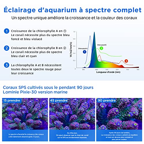 Full SPECTRUM- COB LED, Pixie 30 è costruito con una lente a 90 gradi e chip da 24 pezzi, una forte trabilità, fornendo un'illuminazione uniforme per l'acquario marino. Spectre complet comprenant 6 couleurs (bleu, bleu royal, blanc, UV, rouge, vert) qui fournit des coraux, des poissons et d'autres créatures avec des couleurs étonnantes.