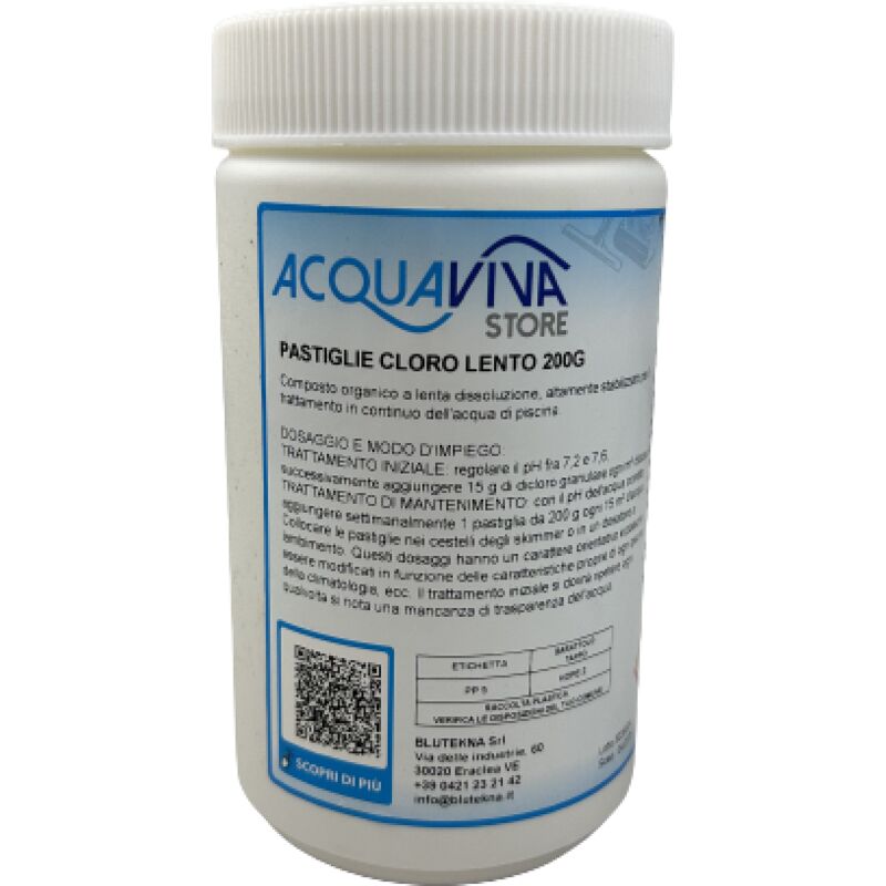Pastiglie cloro piscine perfette per vasche fuori terra e interrate di piccolemedie dimensioni. Confezione da 1kg. Il cloro in pastiglie Acquaviva è un prodotto sicuro e di alta qualità. Garantisce una disinfezione attiva ed efficace contro alghe, batteri e sostanze patogene. Composto organico a lenta dissoluzione, altamente stabilizzato per il trattamento in continuo dellacqua di piscina. Evita la proliferazione delle alghe e mantiene lacqua limpida e cristallina. DOSAGGIO E MODO DIMPIEGO: TRATTAMENTO INIZIALE: regolare il pH fra 7,2 e 7,6, successivamente aggiungere 15 g di dicloro granulare ogni metro cubo dacqua. TRATTAMENTO DI MANTENIMENTO: con il pH dellacqua corretto, aggiungere settimanalmente 1 pastiglia da 200 g ogni 15 metri cubi dacqua. Collocare le pastiglie nei cestelli degli skimmer. Questi dosaggi hanno un carattere orientativo e possono essere modificati in funzione delle caratteristiche proprie di ogni piscina, della climatologia, ecc. Il trattamento iniziale si