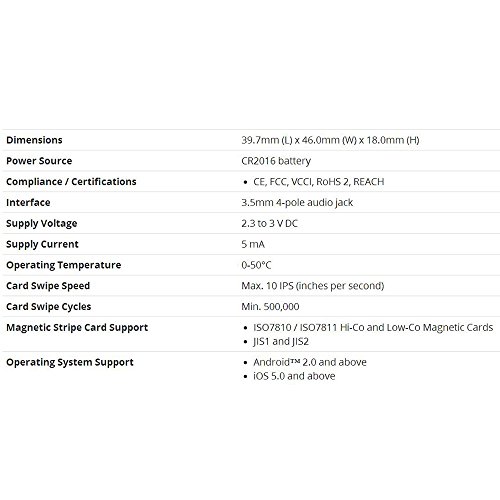 Ultra compatto ACR31 Swipe è stato progettato appositamente per essere portato e utilizzato sempre e ovunque. Una batteria CR2016 (per stabilizzare l'alimentazione) e un'interfaccia audio presa standard 3.5mm ulteriormente permettono ACR31 Swipe di integrarsi perfettamente in qualsiasi telefono intelligente o tablet sul mercato. Costruito con un design moderno, ACR31 Swipe è un lettore di scheda magnetica portatile e leggero è perfetto per transazioni che saldamente, mentre in viaggio.