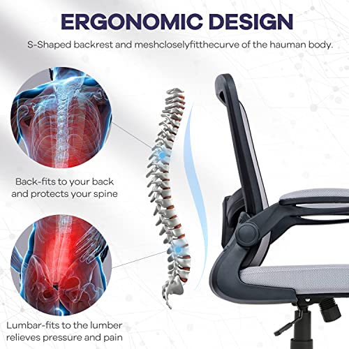 Actask Sedia Ufficio Ergonomica, Sedia scrivania con Braccioli Ribaltabili 90°, Poltrona Ufficio con Supporto Lombare, Inclinazione ad Ondeggiamento, Altezza Regolabile, Carico massimo 130kg-Grigio
