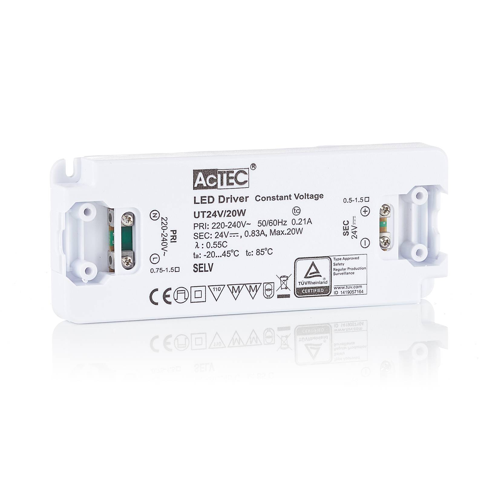 Driver LED a tensione costante Slim 24V 20W, non dimmerabile - design ultrasottile - isolamento SELV - IP20 - protezione da cortocircuito, circuito aperto, surriscaldamento e sovraccarico - 220-240V, 50-60Hz - carico minimo 0,3 W - temperatura ambiente -20 a 45 °C
