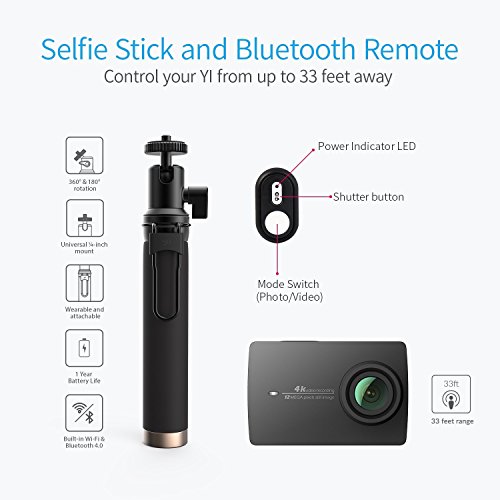 YI Action Camera 4k con Bastone Selfie & Telecomando Bluetooth, Videocamera Action Cam HD 4K / 30 fps, 1080p / 120 fps, Fotocamera Digitale 12 MP, WiFi (Nero)