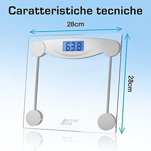 Active Era Bilancia Pesapersone Digitale Ultrasottile con Sensori di Precisione Accensione e Spegnimento Automatico in Vetro Temperato. Misurazione in stone/kg/libbre