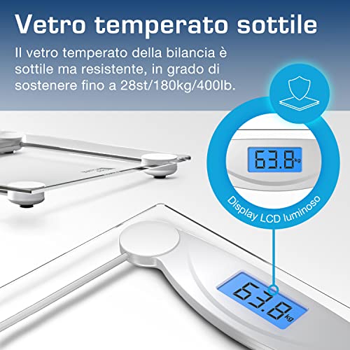 Vetro temperato: Grazie alla sua piattaforma ampia di 30 x 30cm in vetro temperato etra resistente di 6mm di spessore, la rende sicura e resistente allo stesso tempo. Inoltre, questa piattaforma garantisce una uniforme distribuzione del peso.
