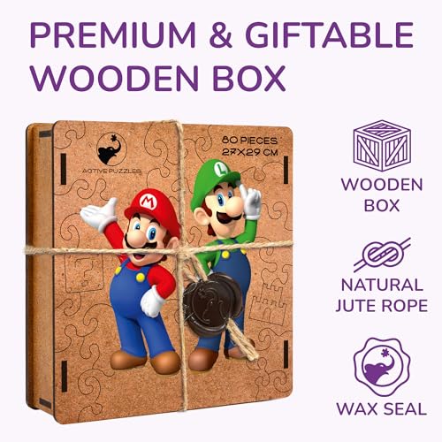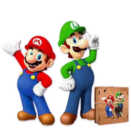 Caratteristiche del puzzle: il puzzle Mario & Luigi ha una piccola dimensione, misura 27 x 29 cm e pesa 110 grammi. È composto da 80 pezzi a forma di nuvola, castello, stella, elefante, tra gli altri. I colori utilizzati sono all'interno della gamma multicolore. Il puzzle viene fornito in una scatola di legno con l'immagine sul davanti e la confezione misura 14 x 15 x 4 cm con un peso totale di 410 grammi. La dimensione del puzzle è superiore alla media offerta da altri produttori.
