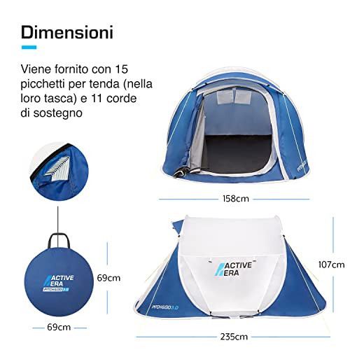 TECNOLOGIA EASY PITCH: La tenda da campeggio V3 di Active Era utilizza un sistema pop-up avanzato che consente il lancio istantaneo della tenda e la chiusura in pochi minuti. Abbiamo incluso una guida passo passo facile da seguire per aiutarti a ripiegare la tenda pop up.