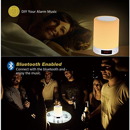 1.Multifunzione: La lampada da comodino tavolo composta di tante funzioni, Lampada nottura+ altoparlante bluetooth + FM radio + orologio + sveglia. 5 funzioni in 1 dispositivo, salva spazio, risparmiare denaro e conveniente.