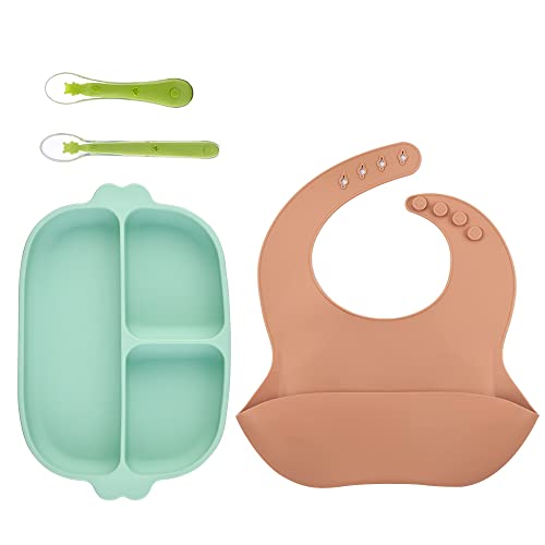 ACwiwil Set pappa per Bambini in Silicone Alimentare, BPA free, Set Pappa 3 pezzi include: bavaglino+ piastra + 2 cucchiai in silicone, Set Svezzamento prima pappa- verde