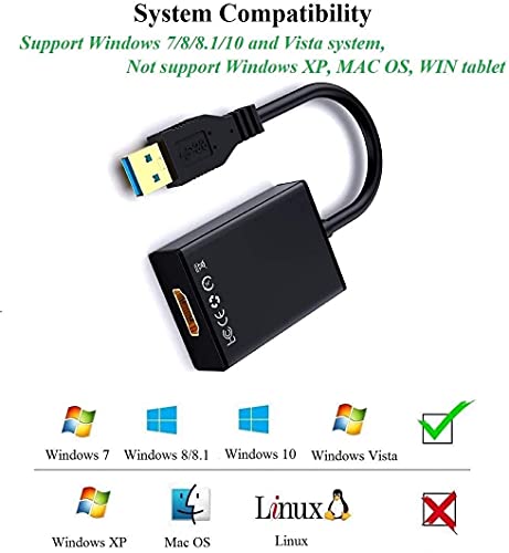 Adattatore da USB a HDMI, adattatore da USB 3.0/2.0 a HDMI 1080P Full HD (maschio a femmina) Convertitore multi-display video e audio compatibile con Windows 7/8/10