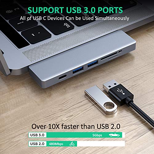 Grande espansione: hub USB C multifunzione, per espandere le porte MacBook Pro a 2 USB 3.0 + lettore di schede SD/Micro SD + USB C (PD), collegamento di potenza e trasferimento dati. Progettato per soddisfare le vostre esigenze con un hub. Il compagno perfetto per il tuo MacBook Air 2018 e MacBook Pro 2016/2017/2018 ecc.