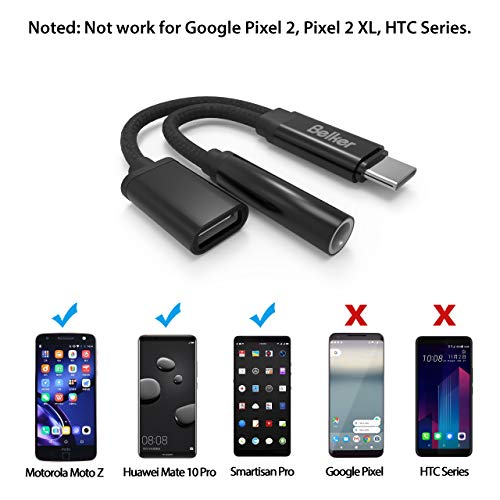 USB C a adattatore jack 3.5 mm, Belkertech nylon intrecciato 2 in 1 di tipo C a 3.5 mm audio cavo di ricarica compatibile con Motoz, Huawei Mate 10 Pro Xiaomi 6 Nubia Z17/nero