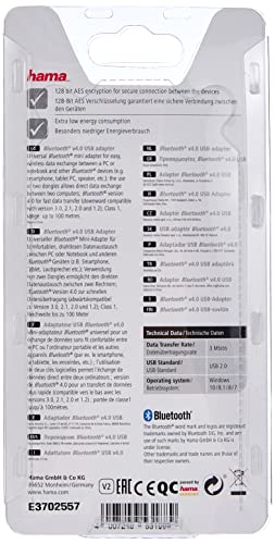 Contenuto della confezione: 1 adattatore USB Bluetooth Hama versione 4.0 C1 + EDR (retrocompatibile con versione 3.0, 2.1, 2.0 e 1.2), 1 x istruzioni (lingua italiana non garantita)