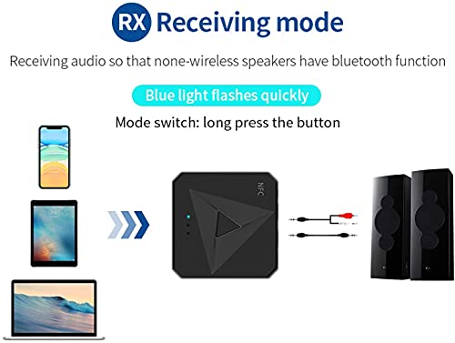 Adattatore audio Bluetooth. Modalità trasmettitore: attiva un televisore non Bluetooth, PC, Bluetooth, e assicurati che i tuoi dispositivi siano collegati senza fili a cuffie o altoparlanti Bluetooth. Modalità di ricezione: perfetto per il sistema audio streaming a casa o in auto. È possibile collegare 2 dispositivi contemporaneamente.