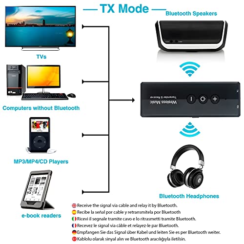 Trasmettitore e ricevitore: design 3 in 1, Bluetooth 5.0, ci sono 2 modalità (TX e RX), può essere un trasmettitore e anche un ricevitore. La modalità TX (luce rossa) è per il trasmettitore e RX (luce blu) è per il ricevitore.