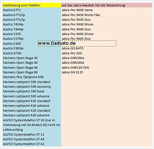 Cavo di collegamento DHSG per le cuffie Jabra Pro della serie 9400, Jabra GO 6470, sostitutivo Jabra Pro 920, Jabra GN9350e, Jabra GN9330e, Jabra GN9120 EHS, Jabra GN9125 e per i telefoni Aastra 6771, Aastra 6773/ip, Aastra 6775/ip, Aastra 7434ip, Aastra 7444ip, Aastra 5370, Aastra 5370ip, Aastra 5380, Aastra 5380ip, Aastra 6739i1.