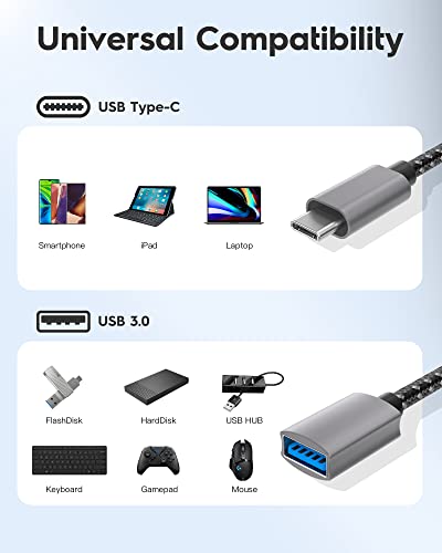 【Compatibilità universale】Questo adattatore OTG USB C è compatibile con i dispositivi con connettore di tipo C. Ad esempio, MacBook Pro 2022/2020, MacBook 2017/2016, Dell XPS 15/13, ChromeBook Pixel, Huawei Matebook, Galaxy S23/S22/S21 Ultra/S9/S9+/Note 10, Google Pixel 7/6/5/4, Huawei P50/P40/P30 Pro, Nexus 5X/6P e altri. Nota: se non siete sicuri che il vostro dispositivo possa utilizzare questo adattatore USB-C, contattateci.